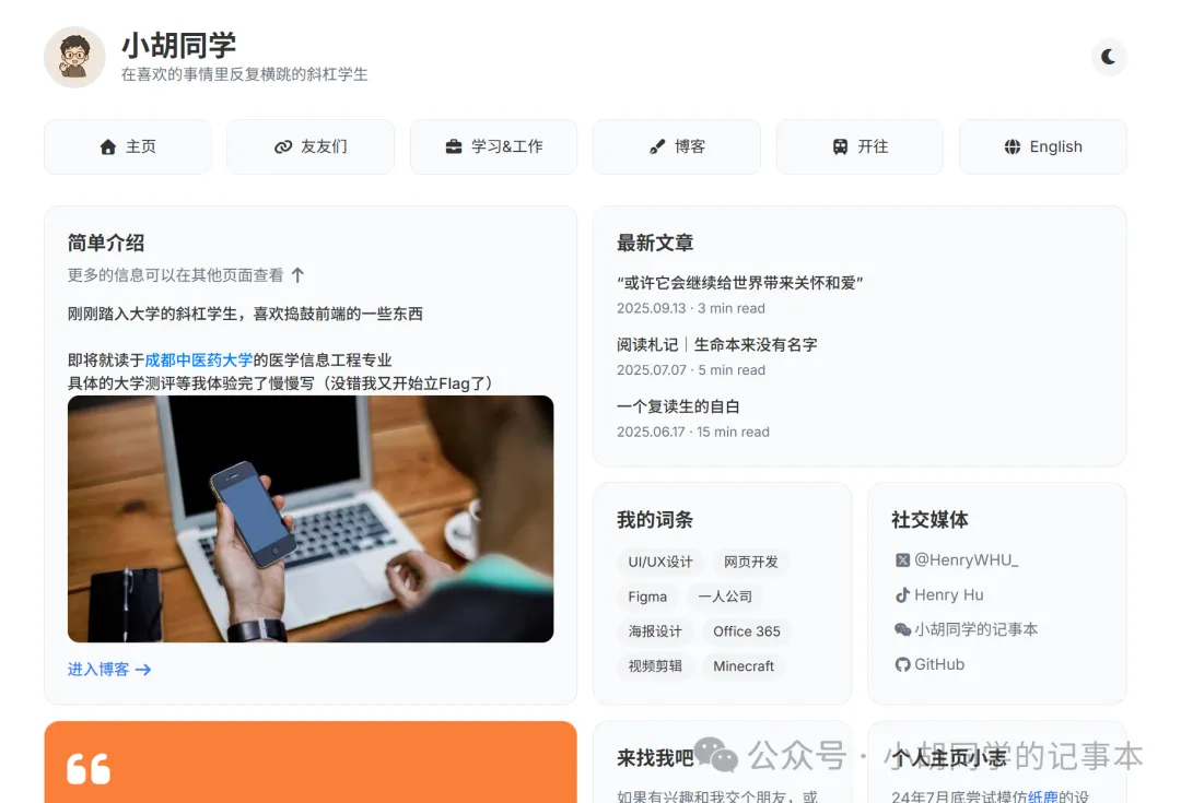 重写主页的想法,其实我在暑假的时候就已经想过了,而且酝酿已久,在网上找了很多好看的样式的进行观摩。思虑许久,我觉得Juan Garcia的网站风格很戳我,ta的网站是用Bento做的,模块化的效果我挺喜欢,于是思虑再三新建了这个文件夹,开始写这个属于自己的网站。